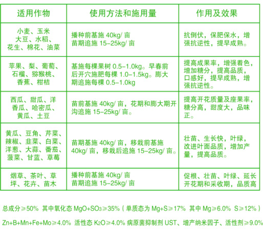 本產(chǎn)品引進國外先進技術,精心研制,科學配比,選用優(yōu)質進口鉀肥和純天然營養(yǎng)元 素,并添加多種作物所需的中微量元素加工而成。內含豐富的營養(yǎng)元素,屬于綠色環(huán)保無 殘留產(chǎn)品,可被作物完全吸收,葉和果實無污染,無殘留。與普通鉀肥相比較,農(nóng)作物可 以提高肥效,具有明顯的增產(chǎn)效果。該產(chǎn)品活性強,可明顯緩解因長期施用化學肥料造成 的土壤板結的狀況。明顯提高作物品質,增加瓜果的著色度,使其口感好,甜度高,增花 保果,增加千粒重,抗寒抗旱,抗倒伏及抗病能力。使作物加快生育成長,促進早熟,提 高作物產(chǎn)量,是經(jīng)濟作物達標的必需之肥,幫助農(nóng)民增產(chǎn)增效,是發(fā)展綠色高效農(nóng)業(yè)的首 選產(chǎn)品。